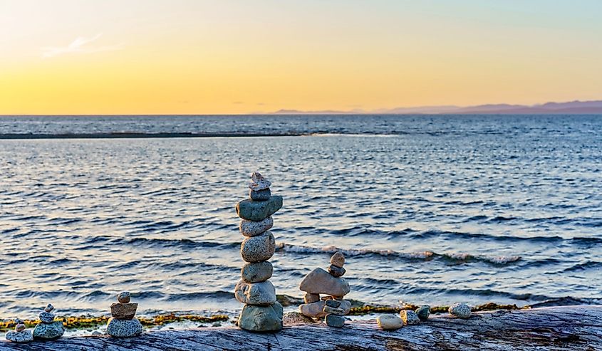 カナダ、ブリティッシュコロンビア州パークスビルの風光明媚なビーチにある岩の山