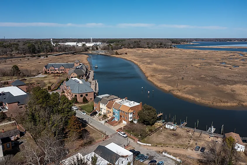 バージニア州スミスフィールドのペイガン川沿いの家々。