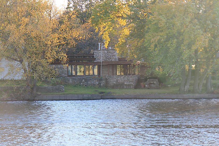 アルビン・ミラー邸は、フランク・ロイド・ライトの建築家によって 1946 年にアイオワ州チャールズシティに建てられました。編集クレジット: Jim Packett / Shutterstock.com