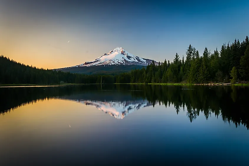 オレゴン州マウント・フッド・ビレッジ近くの静かな湖と雪を頂いたマウント・フッド。