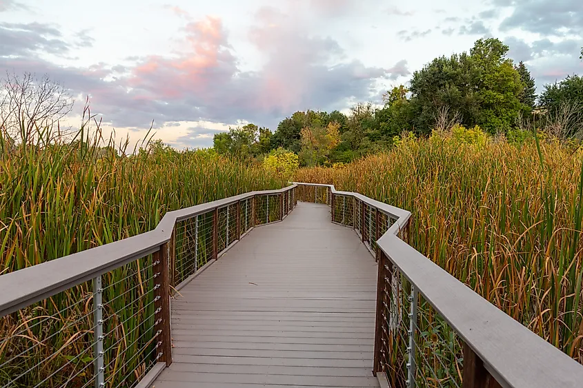 米国コロラド州ウィートリッジ・グリーンベルトの草と葦を通る木製の遊歩道。