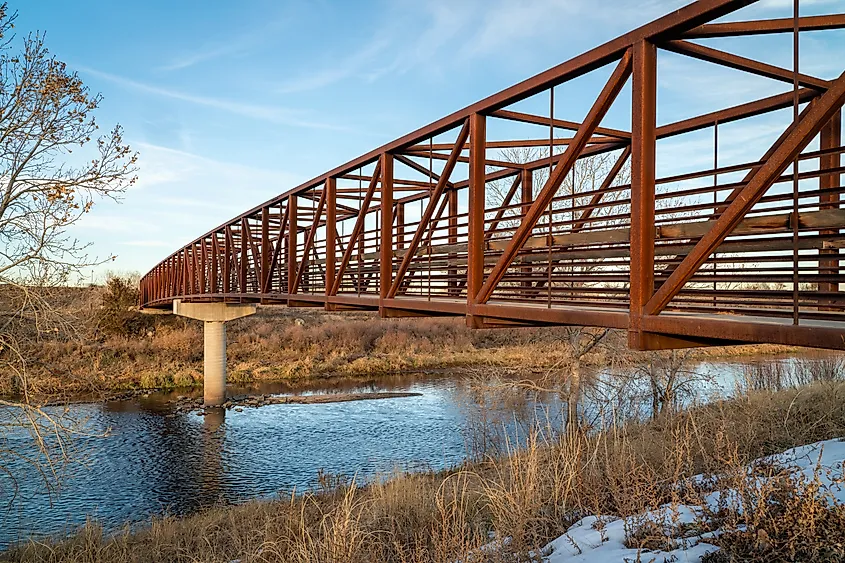 自転車道と川にかかる歩道橋 - コロラド州ブライトン近くのサウス プラット リバー トレイル。