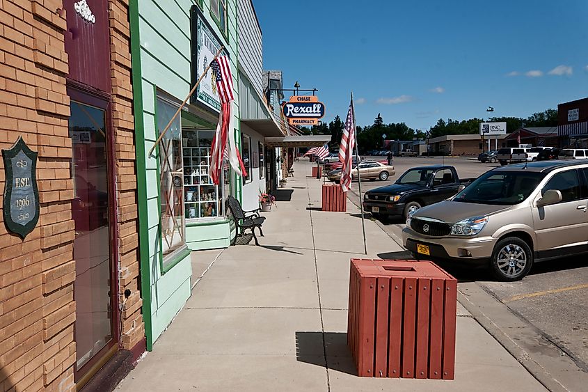 ノースダコタ州ギャリソンの町の通りに沿って店が並んでいます。アンドリュー・ファイラー著 - https://www.flickr.com/photos/afiler/6176528631/、CC BY-SA 2.0、ウィキメディア・コモンズ。