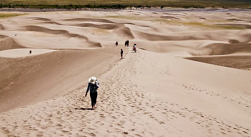 ハイカーはグレート サンド デューンズ国立公園および保護区の一部を横断します。