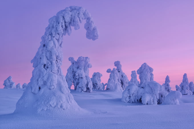 ラップランドの下流では、リジトゥントゥリは冬のワンダーランドで、冬の間は粉っぽい白い雪の厚い毛布で覆われています。このエリアは、その自然の美しさに貢献する傾斜した丘と風光明媚な湖でもある、雪が大きい雪の木の木だけでなく、特に有名です。ここのユニークな景色は、ヨーロッパの他の場所とは異なり、写真に興味がある人や、美しい広大な白さをじっと見つめる人に最適です。