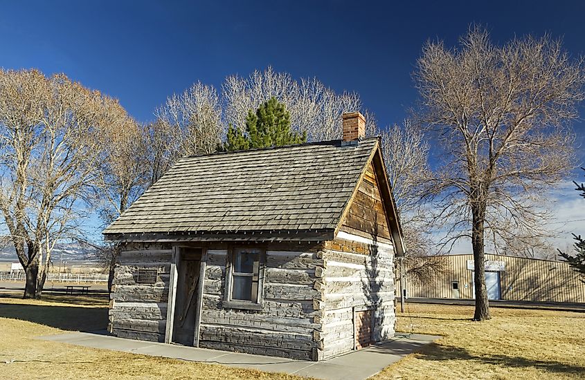 モルモン パイオニア ヘリテージ パークにある古いワイルド ウェストの丸太小屋。ユタ州パンギッチ。編集クレジット: Autumn Sky Photography / Shutterstock.com