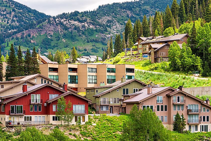 夏にユタ州アルビオン盆地から見た小さなスキーリゾートの町の村とリトルコットンウッドキャニオンの街並みの眺め。編集クレジット: Andriy Blokhin / Shutterstock.com