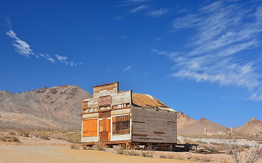 ネバダ州流紋岩にある放棄された流紋岩商館。マイク・マクベイ著 – 流紋岩ゴーストタウン、CC BY 2.0、ウィキメディア・コモンズ.