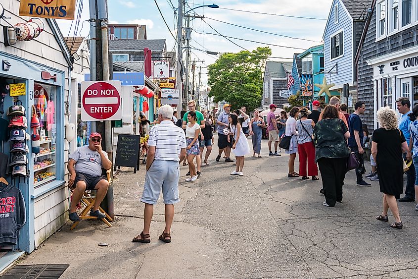 マサチューセッツ州ロックポートの通りや数多くの店舗を人々や観光客が散策します。編集クレジット: starmaro / Shutterstock.com