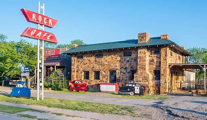 オクラホマシティの東、オクラホマ州中央部にあるストラウドがあります。古典的なアメリカの村を頭の中で思い浮かべるとき、おそらくストラウドが思い浮かぶでしょう。町の建築物の多くは、ルート 66 沿いの必見スポットとしての名声にインスピレーションを得たものです。ロック カフェは 1939 年のオープン以来、古典的なアメリカ料理を提供し、国中から旅行者を集めました。このカフェは非常に象徴的で、ピクサー映画「カーズ!」のキャラクター、サリー カレラのインスピレーションとなったほどです。
