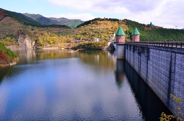 鳴渕ダムは篠栗町にある高さ約68m、長さ308mの多目的ダムです。放出弁室を含む施設の屋根は、緑色のとんがり帽子のような奇抜なデザインで、おとぎ話のような雰囲気を醸し出しています。平日限定ではありますが、ダム施設の見学もでき、ダム通になれるかも!