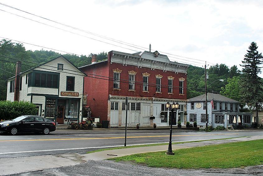 ニューヨーク州フェニキアの町の山々に囲まれたメインストリートの眺め。 Daniel Case 著 – 自身の作品、CC BY-SA 3.0、ウィキメディア・コモンズ。