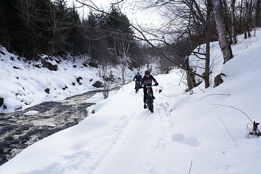 ウィスコンシン州メリルでは、冬に川沿いでサイクリングを楽しむ人々。編集クレジット: LA Photography / Shutterstock.com の Aaron。