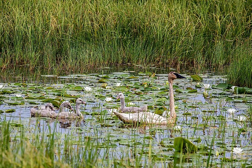 ウィスコンシン州グランツバーグ、クレックスメドウズ州立野生生物保護区のファントム湖にいるトランペッターハクチョウとその赤ちゃんシグネット。