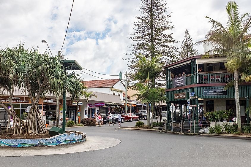 オーストラリア、ニューサウスウェールズ州バイロンベイの中心にあるショップや企業。