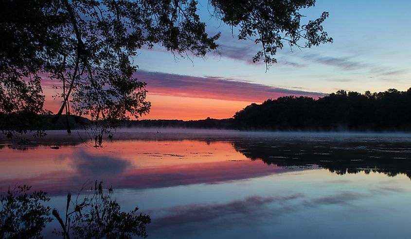 コネチカット州ウィンザーロックスのコネチカット川に映る日の出