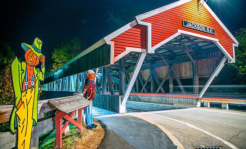 ニューハンプシャー州ジャクソンのハロウィーン期間中の木製の橋。