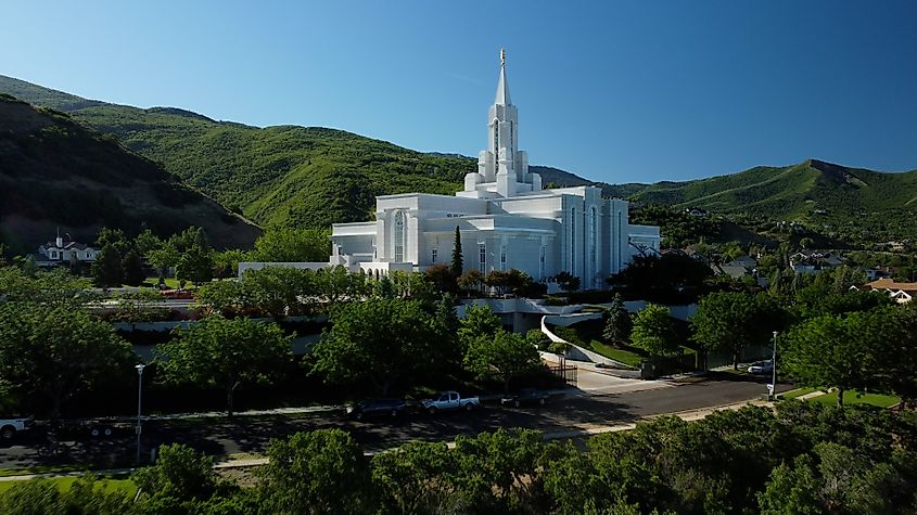 ユタ州バウンティフルにある象徴的なユタ神殿。編集クレジット: カレッジ大学 / Shutterstock.com