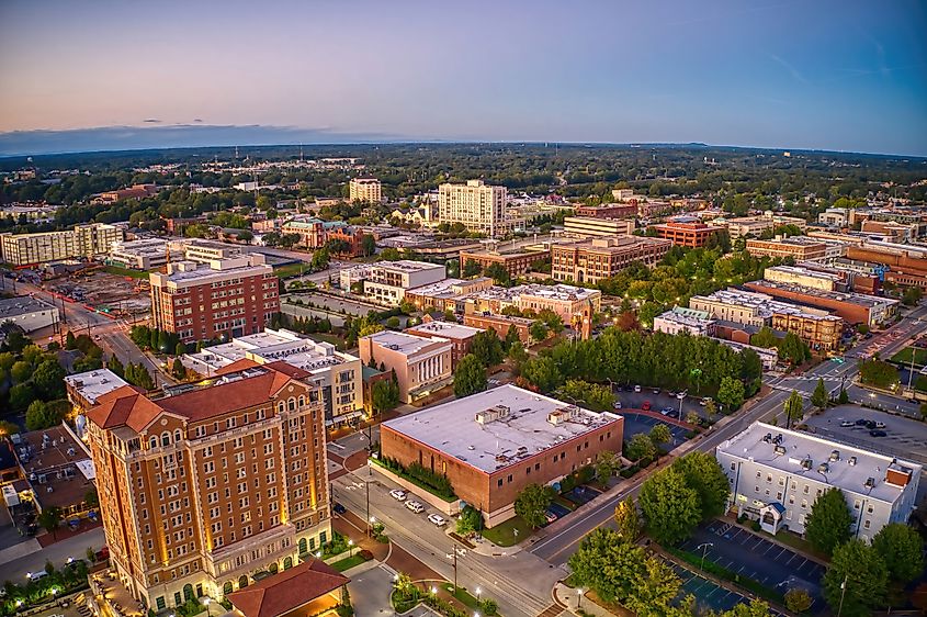 サウスカロライナ州スパルタンバーグの空中景色、夕暮れ。