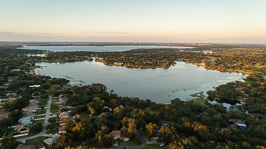 ユースティスのダウンタウンにあるフェラン公園に面したユースティス湖のドローンビュー。編集クレジット: Noah Densmore / Shutterstock.com
