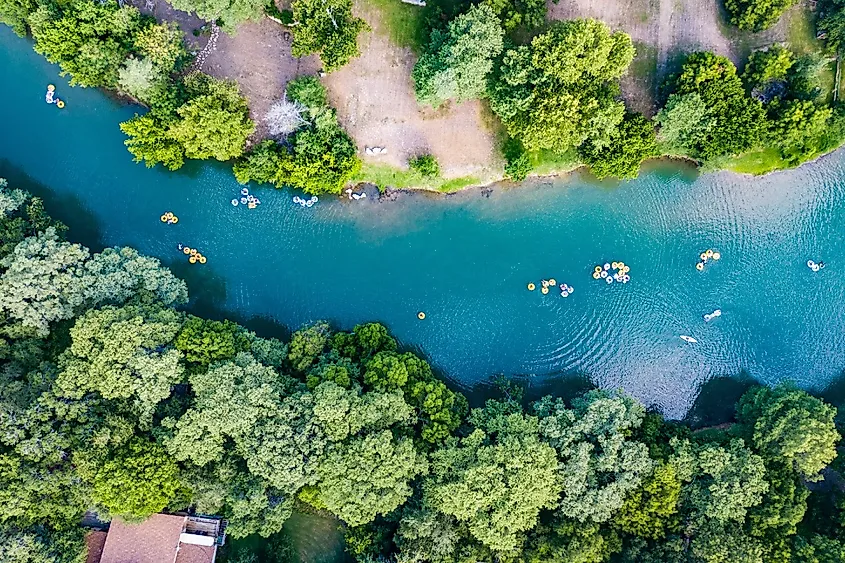 テキサス州ニューブラウンフェルズにあるグアダルーペ川の垂木を見下ろす。