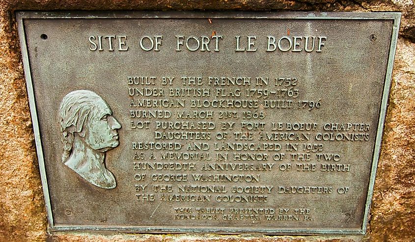 時々フォート デ ラ リヴィエール オー ブフと呼ばれるルブフ要塞は、1753 年にフランス人によって、現在のペンシルベニア州北西部ウォーターフォード、ルブフ クリークのほとりのエリー郡にあるフレンチ クリークの分岐点に設立されました。ルブーフ砦は、フレンチ・インディアン戦争中にフランスの戦略的な前哨基地として機能しました。ここは、1753 年 12 月にジョージ ワシントンがフランス軍の撤退を要求するメッセージを伝えた場所でもありました。これがフレンチ・インディアン戦争につながりました。砦は戦争の長年にわたって所有者が変わりました。 1763 年のポンティアックの反乱中にネイティブ アメリカンによって捕らえられ、破壊されました。