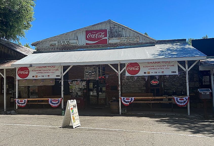 1852 年に建てられたサイズモア カントリー ストアは、継続的に運営されているカリフォルニアで最も古い雑貨店の 1 つで、かつてはゴールド ラッシュに沸いたシエラ ネバダ山麓の町ボルケーノで地元の人々にサービスを提供してきました。ボルケーノの町はカリフォルニアの歴史的建造物として登録されています。ここは、最初の劇団、私立法科大学院、そして 1854 年から 1855 年にかけてボルケーノで開校された最初の私立学校など、いくつかの「初」の本拠地であると主張しています。