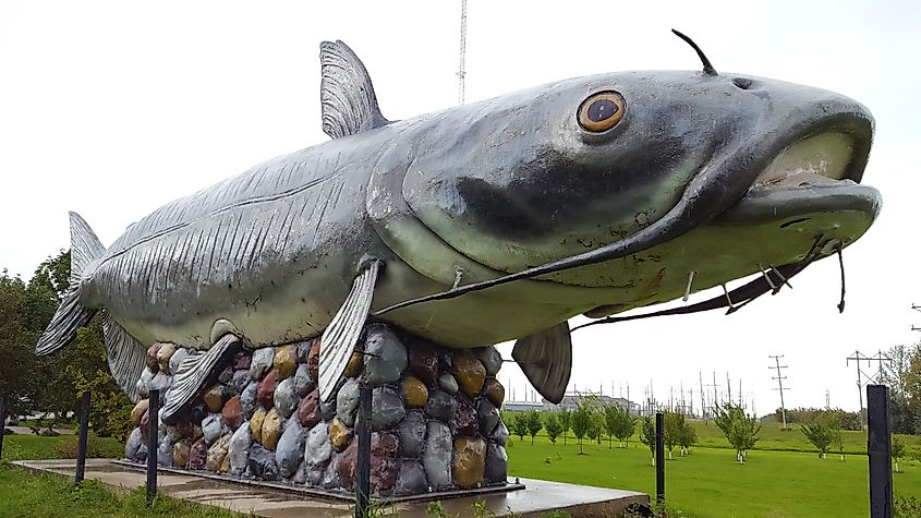 北の赤い川のほとりにある巨大なナマズの像「ワッパー」。 Skvader 著 – 自身の作品、CC BY-SA 4.0、ウィキペディア。