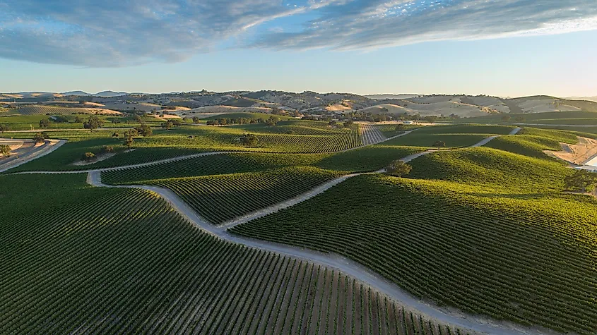 カリフォルニア州パソロブレスの丘陵地帯に広がる広大なブドウ園。