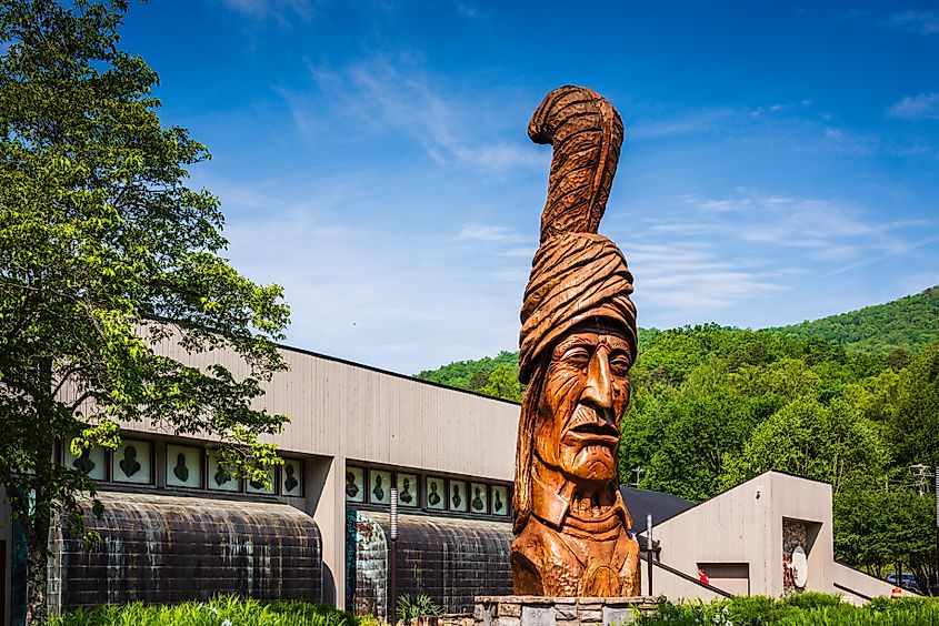 ノースカロライナ州チェロキーのチェロキー・インディアン博物館の前にある巨大なセクォイア像。編集クレジット: Sandra Foyt / Shutterstock.com。