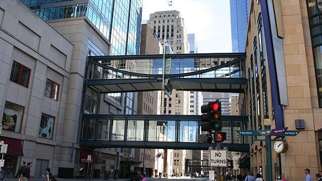 ミネアポリスには、「ミネアポリス スカイウェイ システム」と呼ばれるこのシステムの独自バージョンがあります。冬の気温が氷点下になることが多いこの都市では、この囲まれた歩道のネットワークが市内の多くの建物を結んでいます。このユニークなシステムが観光客の注目を集めています。