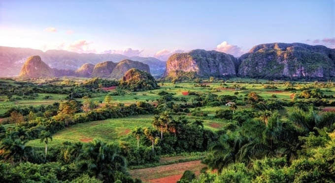 1999年に文化遺産のサイトとして登録されたビニャーレスバレーは、キューバのカルストのうつ病です。谷のふもとでは、タバコが栽培され、ユニークな風景が生まれています。人気の魅力は、メキシコの画家ディエゴリベラと1921年の5年間で15人のアシスタントによって、高さ20メートル、幅120メートル以上の岩に描かれた壁画です。自然環境と壁画の対照的な色は、ユニークな視覚的影響を生み出します。
