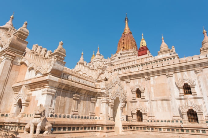バガン周辺の寺院の中で最も有名なアナンダ寺院は、12 世紀初頭にキャンジッタ王によって建てられ、最も保存状態が良く、最大規模の寺院の 1 つです。通常、ほとんどの人が訪れる寺院のリストの最初に入るアナンダは、地震によって一部が破壊されましたが、その後美しく修復されました。現在、それはこれらの古代遺跡を最もよく表現しているものの 1 つです。