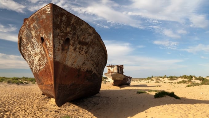 かつて、ヌクスの北には、世界で4番目に大きい湖であり、漁業の繁栄したハブであったアラル海がありました。しかし、戦後のソビエト連邦による過度の灌漑プロジェクトの後、湖に流れる水の量は劇的に低下しました。その結果、アラル海は急速に縮み始め、最終的には複数の小さな湖に分かれました。