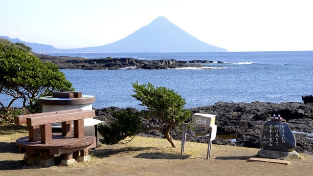 参拝後は、境内の左端にある「希望の岬」からの絶景もお見逃しなく。伝統的な釜蓋の形をした独特の茅葺屋根の東屋と、くつろぎのテーブルや椅子が設置された景勝地です。ここからは、海の向こうに優雅にそびえる「薩摩富士」とも呼ばれる開聞岳を眺めることができます。完璧な三角形の山と海との見事なコントラストは、忘れられない鹿児島ならではの風景です。