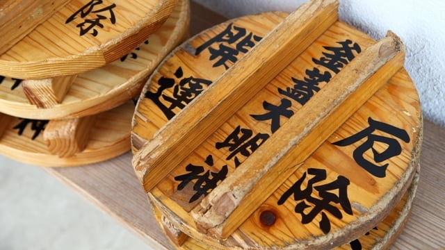 釜蓋神社の最大の特徴は、その独特な参拝方法!神社には小・中・大の3種類の釜蓋が用意されています。参拝者は好みのサイズを選んで頭に乗せ、落とさずに鳥居から本殿まで歩きます。蓋が落ちずに神社までたどり着くと願いが叶うと信じられています。