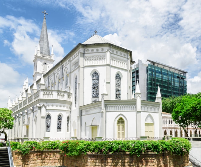 このプライベートな会場は、コリンとアラミンタの涙の結婚式のシーンのための架空のファーストメソジスト大聖堂に変身しました。礼拝堂の外では、Chijmes(「Chime」と発音)は、バー、レストラン、カフェがいっぱいのラッフルズホテルの近くにある大きな商業コンプレックスです。過去には、この遺産の建物は、聖なる幼児のイエスガールズスクールの修道院であり、狂った豊かな結婚式のシーンが撮影された学校のかつての礼拝堂は現在、プライベートパーティー会場として使用されています。