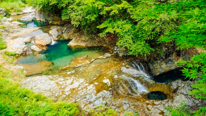 甌穴を抜け、四万温泉に向かって国道を北上すると、ゴツゴツした岩の間で四万川が狭くなる地点に着きます。この場所は「釜ヶ淵」と呼ばれ、古くから四万川の名勝として知られています。