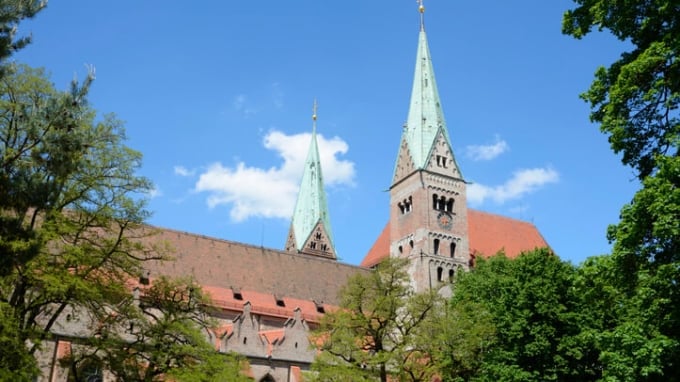 アウクスブルク大聖堂はアウクスブルク観光のハイライトの一つです。 944 年に設立され、14 世紀にゴシック様式に改修されたこの寺院は、高さ 62 メートルの細長い塔と回廊のある広大な身廊が特徴です。この大聖堂は、ダビデ王と他の 4 人の預言者を描いた世界最古の 1140 年に作られたステンド グラスの窓で特に有名です。
