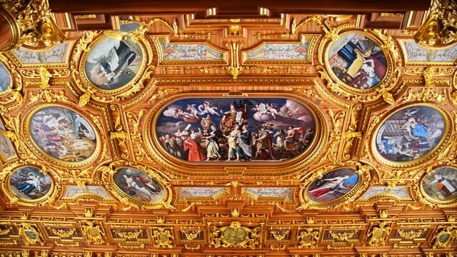 この市庁舎が建設された当時、アウグスブルクは4階の大広間「黄金の間」に象徴されるように、フッガー家のもとで他に類を見ない繁栄を誇っていました。金箔と高さ 14 メートルの天井まで届くフレスコ画で装飾され、訪問者に畏敬の念を抱かせます。精緻な細工を鑑賞して首が痛くなる観光客もいるという。