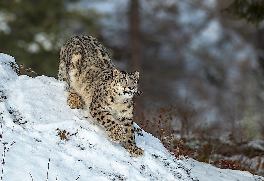 ゴツゴツした山頂に住むには、巨大な敏ility性が必要であり、スノーヒョウはスペードにあります。彼らの低毛の体と短く強力な後ろ足は、単一の境界で最大50フィート(15 m)まで跳躍することができる並外れたジャンパーになり、彼らの長い尾は、彼らが獲物を追求して危険な地形をナビゲートするときに彼らのバランスを維持するのに役立ちます。コートの斑点のある灰色の色は、彼らに効果的なハンターになります。遠くから、雪に覆われた岩の多い山の地形を背景にそれらを見つけることはほとんど不可能です。