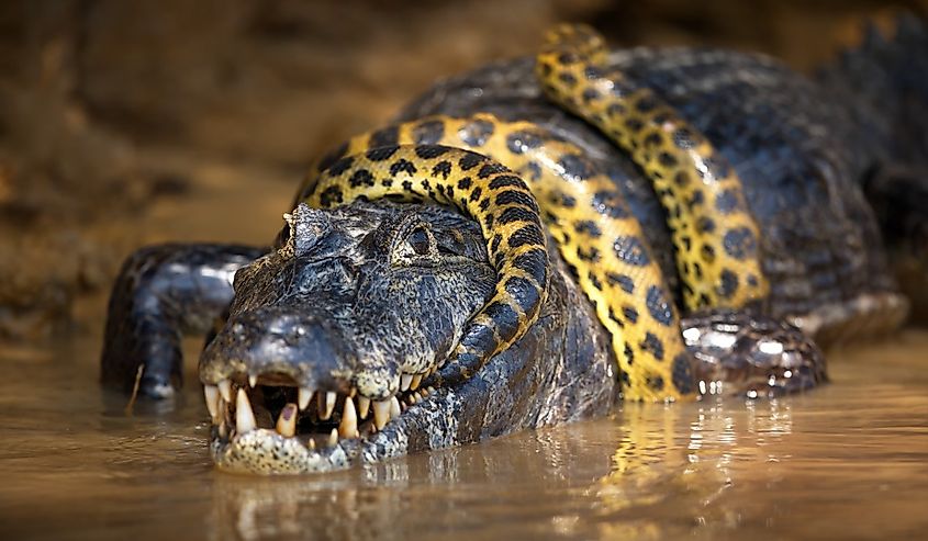 アナコンダは 4 ~ 6 週間に 1 回だけ食事をする必要があります (前回の食事の量によって異なります)。したがって、彼らは水面下で辛抱強く待ち、機会があれば待ち伏せ戦術を展開することができます。アナコンダは、気取らない犠牲者をひったくると、その強力な体を使って窒息するまで生き物を(水面上または水面下で)締め付けます。この不快なプロセスは完了するまでに数分しかかかりませんが、実際の摂取と消化にはさらに時間がかかります。アナコンダは、顎を外すことによって、大きな動物(鹿、犬、羊、さらにはワニやカイマンなど)を丸呑みすることができます。そうすることで、消化に最大 1 週間かかる場合があります。若い個体、あるいは単に体が小さい個体は、カメ、魚、両生類、鳥に重点を置き、必要に応じて木に登ったり、巣を襲撃したりすることができます。