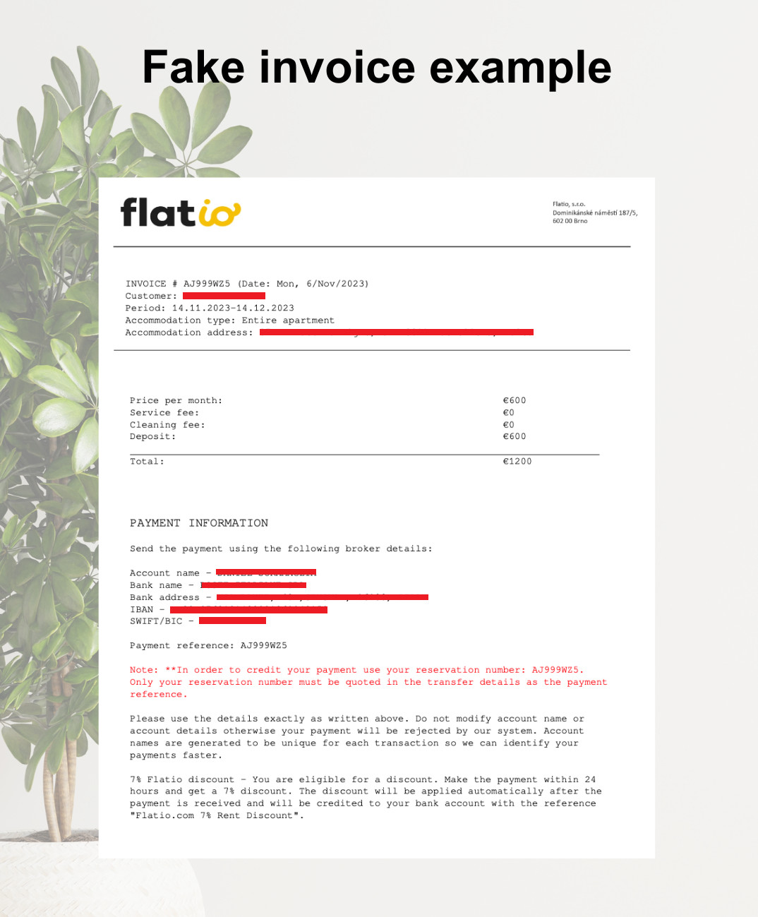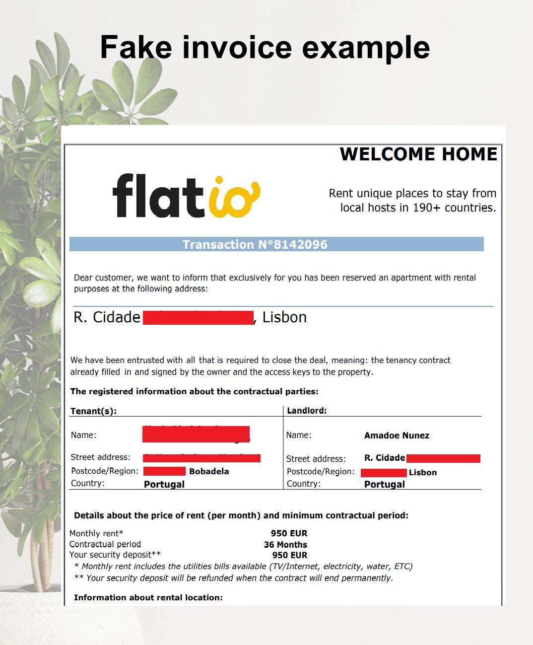 一部の潜在的なゲストは、詐欺師から存在しないサービスのために送金を求められただけでなく、偽の請求書とFlatioの名前とロゴ.