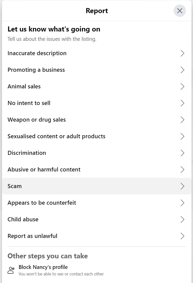 以下のスクリーンショットからわかるように、ユーザーは不審なリストを簡単に報告できます「」をクリックするとレポート一覧” として報告し、”詐欺「。彼らはまた、疑わしいプロフィールを報告する「」をクリックすると、報告」ボタンを押します(下記参照)。