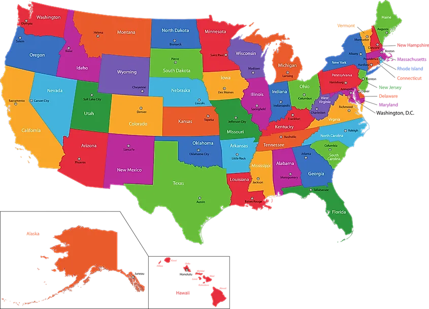 その名前が示すように、アメリカ合衆国はさまざまな州 (正確には 50 州) で構成されています。いわゆる米国本土には 48 の本土州があります。他の 2 つの州、アラスカ州とハワイ州は米国本土から物理的に隔てられており、前者はカナダ西部に属する陸地によって、後者は太平洋によって隔てられています。