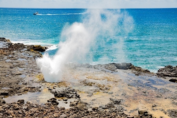 噴出ホーンは、シェラトンカウアイリゾート内にあるブローホールで、海水が海岸線に沿って溶岩の岩の穴に入り、上向きに撃ちます。スパウトを撮影するときはタイミングが重要です。大きな波が岩に近づくと、水が大きなro音で空中に高く撃たれるので、波を見て、完璧なショットを辛抱強く待ちます。
