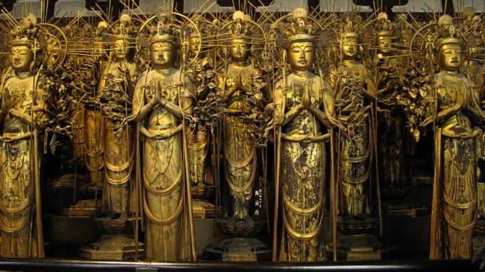 京都国立博物館の向かいに位置するレンゲオインテンプルは、1,000人の等身大の慈悲の女神であるカンノンの1,000人の等身大の彫像で有名です。寺院のメインホールは、約120メートルに伸びており、柱の間に33個の湾があり、サンジサンゲンドという名前(「33ベイのホール」を意味します)を付けています。