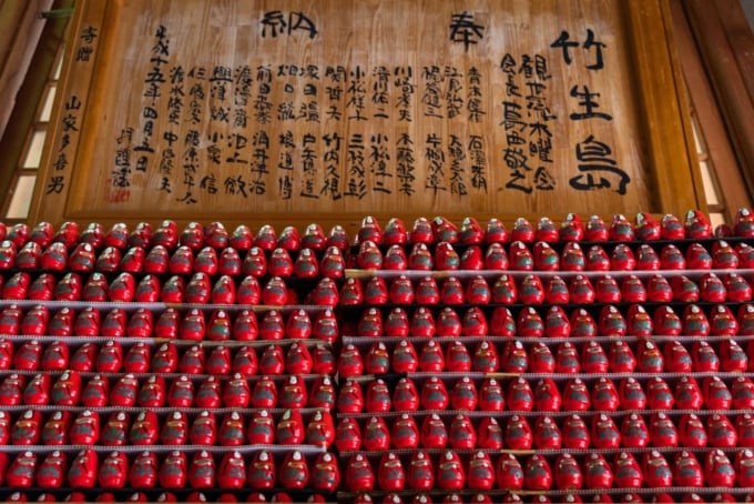 法源寺境内には「弁天の幸福祈願だるま」があります。紙に願い事を書いてだるまの中に差し込んで奉納すると、願いが叶うという言い伝えがあります。だるまは熟練の職人が一つ一つ手作りしているため、同じものは二つとありません。