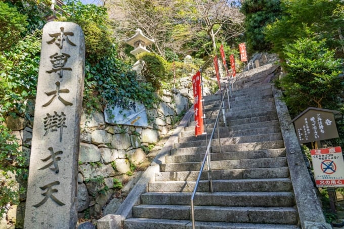 竹生島に上陸すると、すぐに目を奪われるのは長い石段。 「祈りの階段」として知られる165の階段があります。鳥居をくぐり、この石段を登ると法源寺の本堂があります。