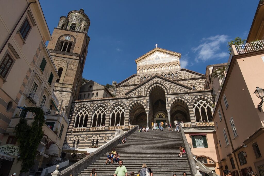 Amalfiでは、少し違っています。イタリアの沿岸の町アマルフィの中央広場デルオーモ自体では、特に午後の光の中で輝くとき、キャットドレールディサンアンドレアの金色のファサードは印象的です。その地下室には、聖アンドリューの頭蓋骨を含む中世の遺物があります。